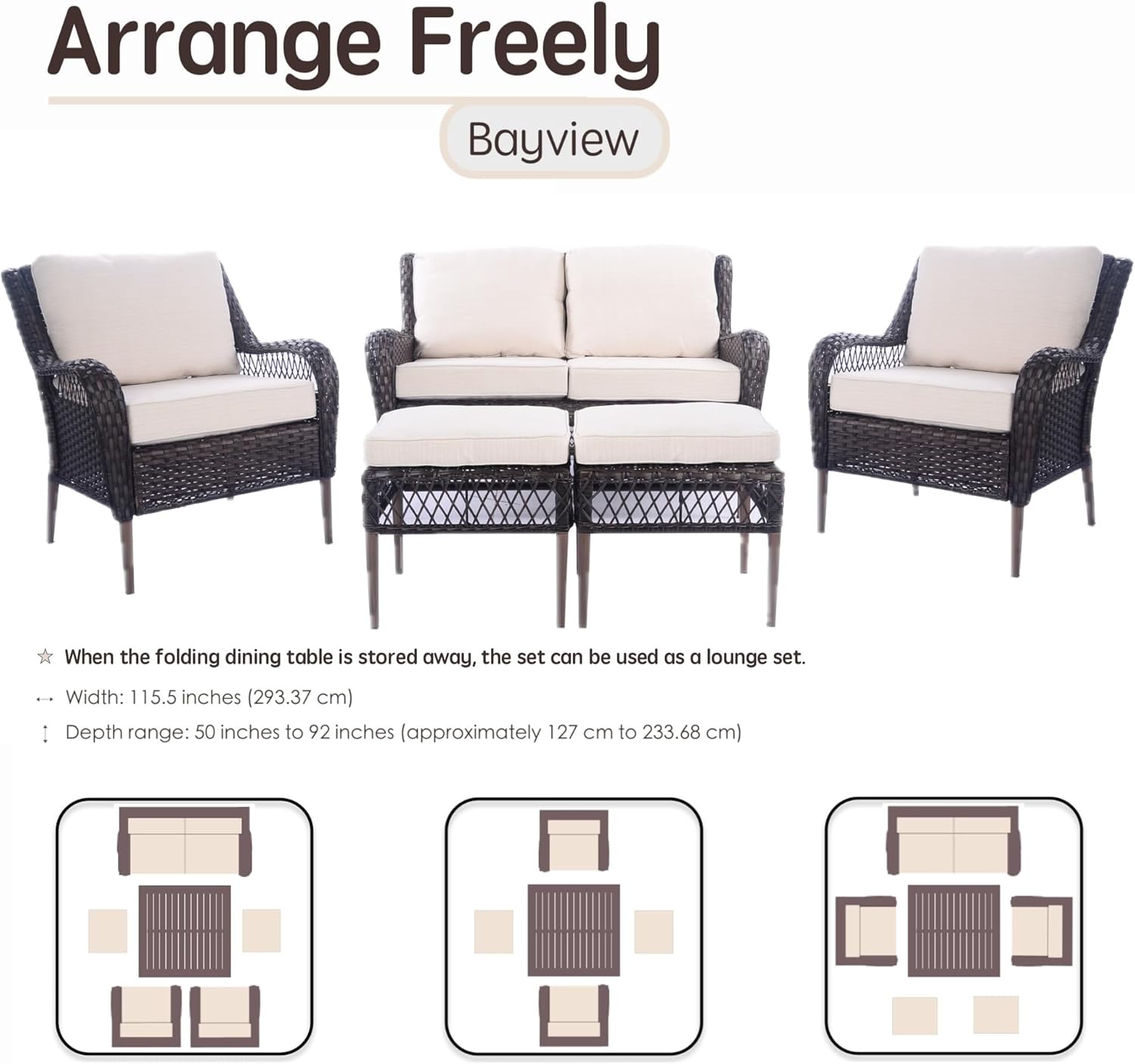 Transform your backyard, deck, or poolside into a high-end resort. Bayview 6-Piece Patio Set is designed for those who refuse to choose between a dining set and a lounge set. With its modular layout and all-weather construction, it provides a versatile foundation for everything from morning coffee to full-scale outdoor dinner parties.